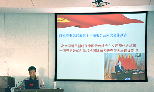 陈飞指出,学校未来发展的宏伟蓝图已经绘就,德赢AC米兰官网“双一流”建设已经启动,全院教职工都要以习近平新时代中国特色社会主义思想为指导,把全面贯彻落实“十九大”精神和学校第十二次党代会精神放在首要位置,切实把思想和认识统一到学校第十二次党代会精神上来,切实把智慧和力量凝聚到实现第十二次党代会提出的奋斗目标任务上来,在学校新一届党委的坚强领导下,以全面加强党的建设为统领,全面落实立德树人根本任务,进一步解放思想、深化综合改革、追求学术卓越,进一步提升教育教学、科学研究、社会服务水平,努力开创各项工作新局面,为把学校建设成为地球科学领域国际知名研究型大学生作出新的更大的贡献。