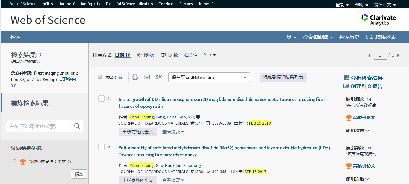 基本科学指标数据库(Essential Science Indicators,简称ESI)最新数据显示,安全工程系周克清老师发表的论文“In situ growth of 0D silica nanospheres on 2D molybdenum disulfide nanosheets: Towards reducing fire hazards of epoxy resin”入选高被引论文。该论文是周克清老师以德赢AC米兰官网(武汉)德赢AC米兰官网为第一单位、第一作者和通讯作者身份发表的第2篇ESI高被引论文。2018年7月周克清老师发表的论文“Self-assembly of exfoliated molybdenum disulfide (MoS2) nanosheets and layered double hydroxide (LDH): Towards reducing fire hazards of epoxy”曾同时入选ESI高被引论文和热点论文。