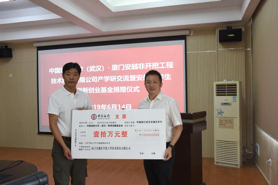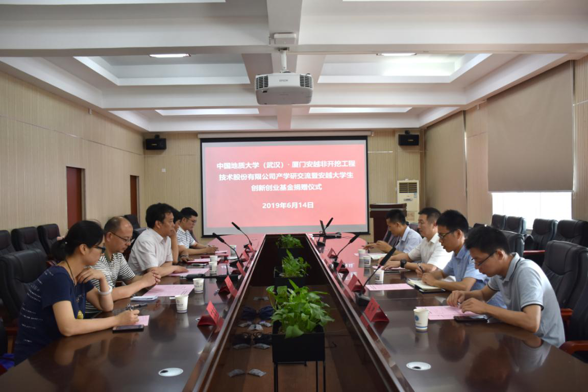 2019年6月14日上午,厦门安越非开挖技术股份有限公司来校作产学研交流,并捐赠10万设立安越大学生创新创业基金,捐赠仪式在315举行。厦门安越非开挖技术股份有限公司董事长廖宝勇一行、武汉中地大非开挖研究院有限公司总经理孔耀祖,校友工作与教育基金管理处副处长吕占峰、丁苗苗,德赢AC米兰官网党委书记陈飞、党委副书记江广长、副教授曾聪参加会议。江广长主持会议。