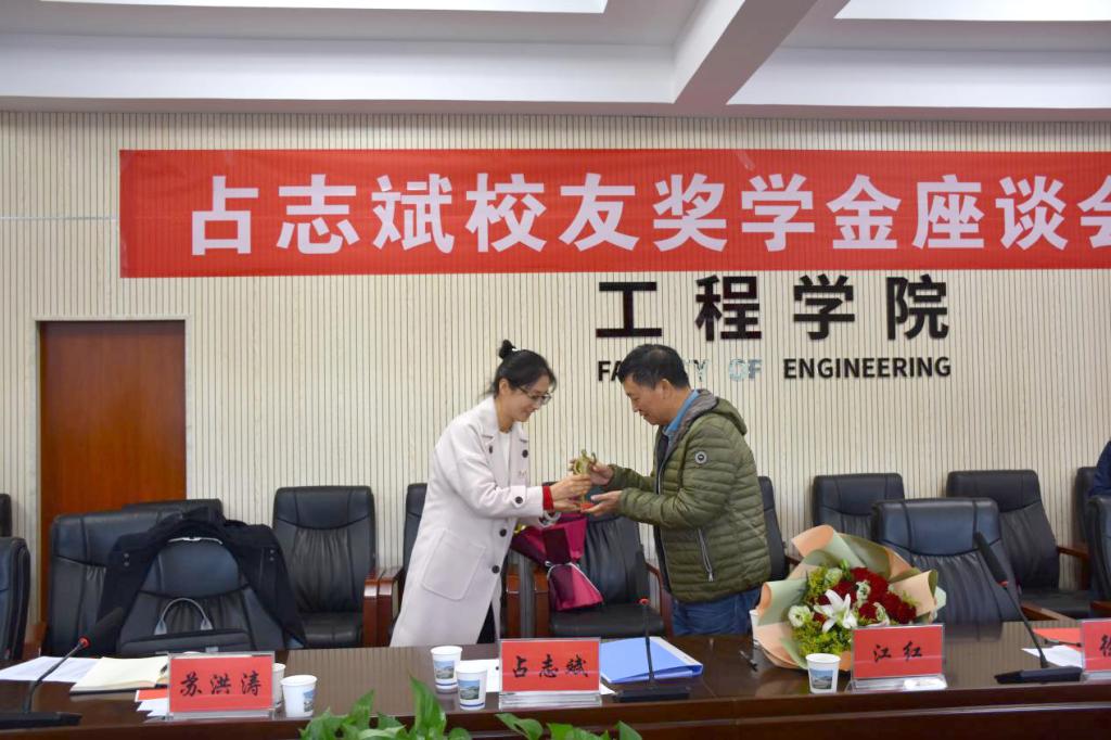 获奖学生代表苏雪雪同学表达了对学校、占志斌校友的感谢,向占志斌校友汇报了自2015年获奖四年以来个人成长的情况。她说“占志斌校友奖学金”不仅为她的生活提供了保障,更重要的是对她的刻苦学习表示了肯定,使她感到非常自豪,激励着她不断拼搏。获奖学生代表李成龙同学谈到“占志斌校友奖学金”体现了占志斌校友对青年学子的关怀关爱;获奖是一份荣誉,也是一种铭记,“占志斌校友奖学金”时刻提醒自己不忘前期的付出,自省自己今天的不足;自己也要像占志斌学长学习,将来回报社会和学校。