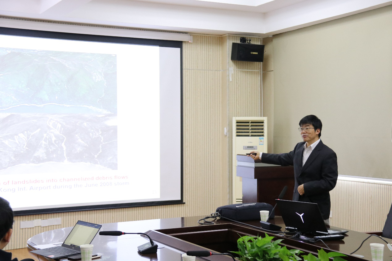 张利民教授以《极端暴雨条件下粤港澳大湾区都市灾害风险》为题,阐述了粤港澳大湾区在气候变化环境下面临的自然灾害风险。详细介绍了暴雨和风暴潮造成的城市灾害链,讲解了城市灾害链的形成过程和引起的连锁效应。同时展示了香港科技大学在智慧城市建设方面所取得的重要进展,并总结了城市灾害分析和定量风险评价方法,以及相关的风险应对措施。报告后,张利民教授与在场师生进行了广泛互动和积极交流。