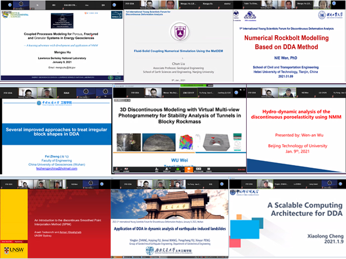 (通讯员:吕加贺 张美霞)2021年1月9日,由国际岩石力学与岩石工程学会非连续变形分析专委会(ISRM DDA Commission)、ISRM中国国家小组(ISRM NG China)、中国岩石力学与工程学会岩土体非连续变形分析专委会(CSRME DDA Commission)联合发起,德赢AC米兰官网(武汉)、天津大学和河北工业大学联合承办的第一届非连续变形分析国际青年科学家论坛(1st International Young Scientists Forum for Discontinuous Deformation Analysis, IYSF-DDA)在Zoom会议平台成功举办,并于矿业人网站、哔哩哔哩平台同步直播,超过350人全程参加了此次非连续变形分析领域的学术盛宴。此次会议主要邀请了岩石力学与工程非连续变形分析领域青年学者,旨在交流非连续变形分析方法的前沿理论和最新研究进展,同时分享岩石力学与工程中非连续变形分析典型工程案例。