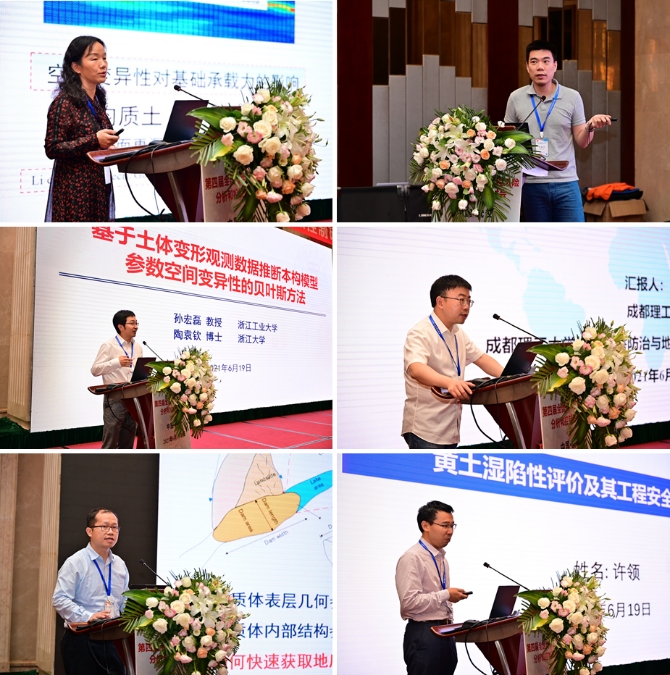 会议期间,各位专家学者以目前各自所属的专业方向及具体研究成果为主要内容,为线下线上参会人员作了精彩的学术报告。德赢AC米兰官网(武汉)唐辉明教授以《基于演化的滑坡防控理论与方法技术》为题作会议特邀报告,美国克莱姆森大学C. Hsein Juang教授在线上作《地质/地层/岩土模型不确定性的量化及影响评价》的特邀报告,同济大学黄宏伟教授以《工程风险管控存在的问题与适应性风险管理》为题作特邀报告,武汉大学李典庆教授以《Copula理论在岩土工程不确定性与可靠性分析中应用进展》为题作特邀报告,重庆大学周小平教授以《场富集有限元法及其应用》为题作特邀报告,中国大地保险张帆总经理应邀以《IDI的实践与思考》为题作特邀报告。