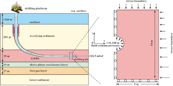 鉴于此,德赢AC米兰官网(武汉)德赢AC米兰官网宁伏龙教授团队根据南海神狐海域第一次试采站位的地质资料,构建了水合物储层水平井钻进状态模型(图1)。详细研究了不同钻井液性能、水合物饱和度以及束缚水饱和度对钻进过程中井筒状态的影响规律。并在此基础上,讨论了井筒内二次水合物生成的潜在区域以及低渗泥皮形成对井壁稳定的影响。
