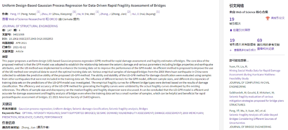 (通讯员:黄静)根据2022年3月基本科学指标数据库(Essential Science Indicators,简称ESI)最新数据显示,德赢官网土木工程与力学系庞于涛副教授团队于2021年在国际结构工程领域顶级期刊Journal of Structural Engineering上发表的学术论文“Uniform design–based Gaussian process regression for data-driven rapid fragility assessment of bridges”入选ESI高被引论文(Highly Cited Paper)。