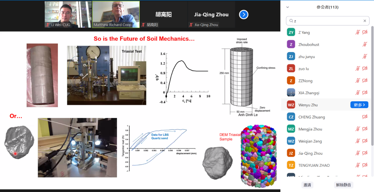 (通讯员 黎伟)2022年7月21日下午,应德赢AC米兰官网(武汉)唐辉明教授和黎伟副教授邀请,伦敦大学学院Matthew Coop教授应邀作客2022年第13期“重大地质灾害预测与防控学科”111创新引智基地系列学术讲座。讲座采用Zoom在线会议形式进行,由黎伟特任副教授主持,周佳庆特任教授、叶阳特任教授、张雅慧特任教授、付茹副教授等以及香港大学、香港城市大学、华中科技大学、浙江大学、中南大学、东南大学、合肥工业大学、西安交通大学、中国科学院武汉岩土力学研究所等多个单位120余名师生在线聆听了此次报告。