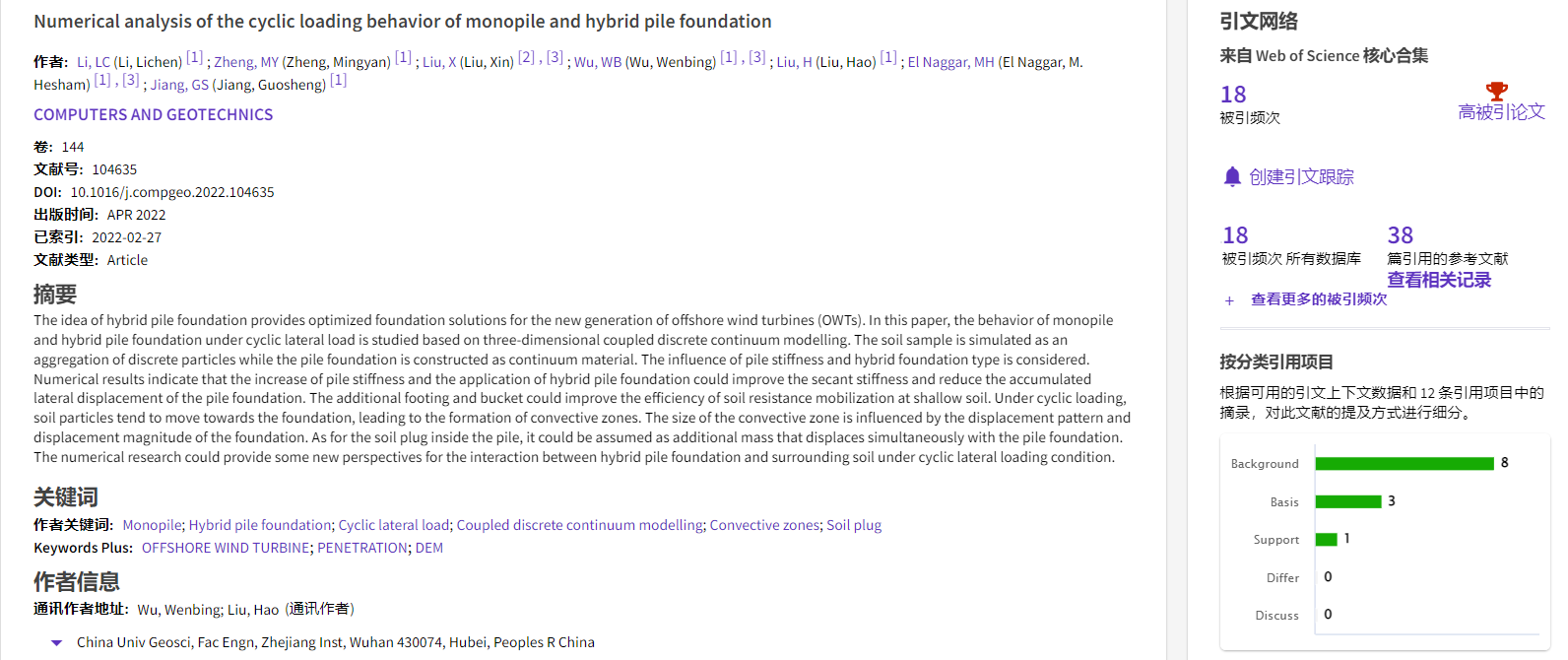 根据2022年11月基本科学指标数据库(Essential Science Indicators,简称ESI)最新数据显示,德赢AC米兰官网勘察与基础工程系吴文兵教授团队于2022年在国际岩土工程数值模拟权威期刊Computers and Geotechnics上发表的学术论文“Numerical analysis of the cyclic loading behavior of monopile and hybrid pile foundation”入选ESI高被引论文。该论文第一作者为勘察与基础工程系博士后李立辰,通讯作者为吴文兵教授,德赢AC米兰官网(武汉)德赢AC米兰官网为第一署名单位。