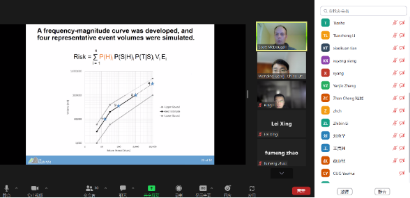 讲座结束后,李长冬教授对Scott McDougall教授的精彩报告表示了感谢,随后参会师生针对滑坡易损性评价方法及滑坡致灾产生的经济损失定量化计算方法、滑坡风险等级划分、中国与加拿大在滑坡风险管理研究上的不同发展路径等相关内容进行了深入讨论和交流。最后龚文平教授对本次学术讲座活动进行了总结发言,感谢了Scott McDougall教授的精彩学术报告,强调了滑坡致灾研究及滑坡易损性研究在滑坡风险评价与防灾减灾领域的重要性,表达了今后能够持续稳固开展同不列颠哥伦比亚大学合作交流的愿景。