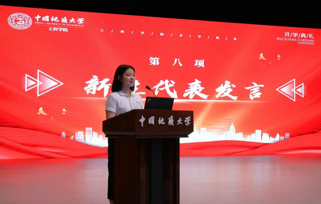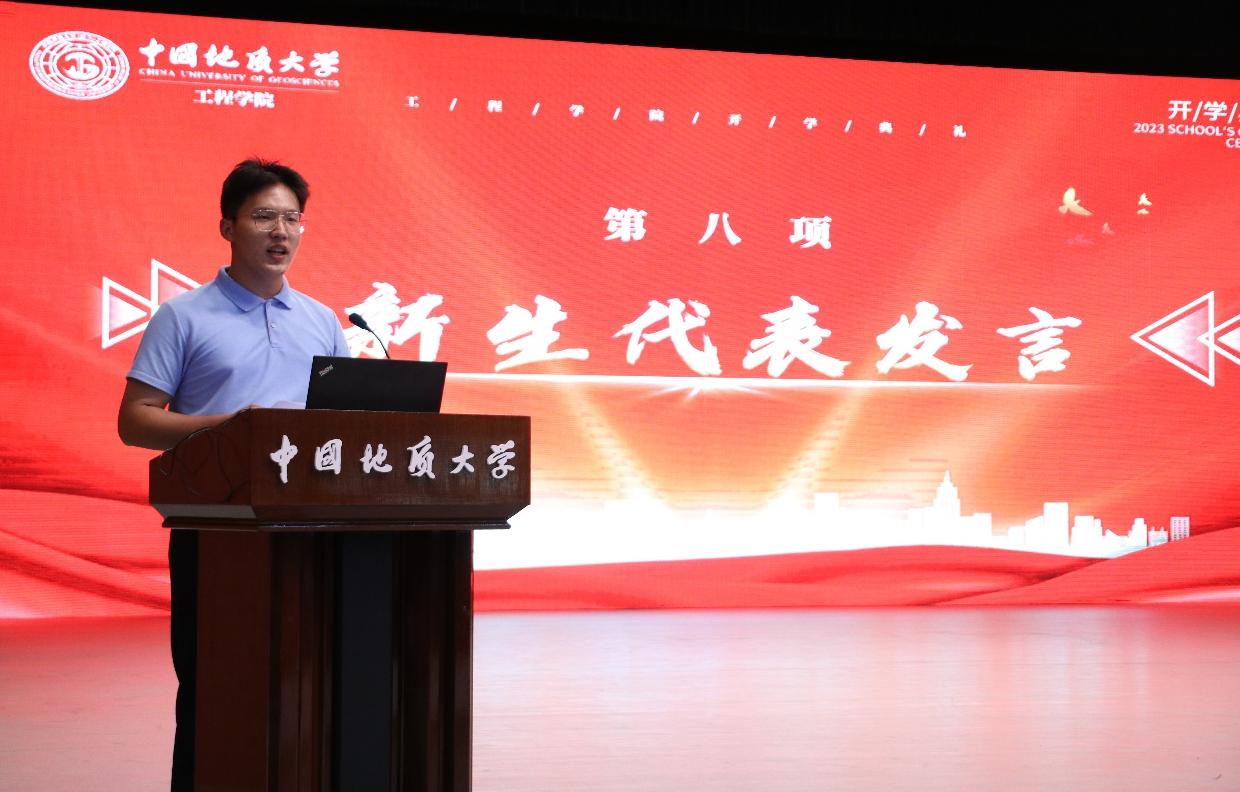 2023级05D231班张高涵同学作为本科生新生代表发言。他说,在长辈厚重岩土气息的熏陶下,自己终于如愿考进地质大学,加入德赢AC米兰官网。他对开学报到以来学院领导老师给予的教育关怀表示感谢,对军事训练当中空军预警学院教官对自己坚忍毅力和良好作息的打造由衷感激,他立志与其他505名本科新生同学一道,以强国建设、民族复兴的时代号召为号角,以“品德高尚、基础厚实、专业精深、知行合一”的成才目标为向导,直挂云帆,乘风破浪,早日成为德智体美劳全面发展的中国特色社会主义事业的建设者和接班人。