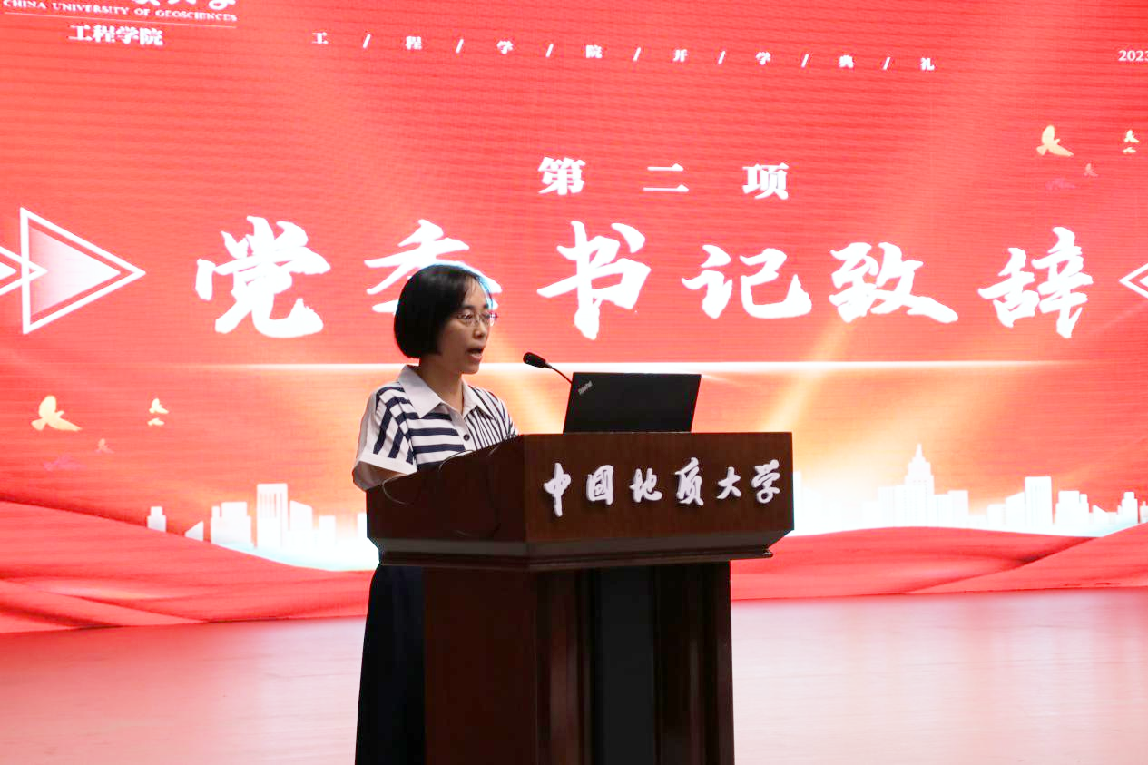 德赢AC米兰官网党委书记李红丽致辞。李书记首先代表全院师生员工对加入德赢AC米兰官网的860名新成员致以热烈的欢迎,祝福同学们选择了德赢AC米兰官网这个温暖而又奋进的大家庭。她指出,当代大学生正值云程发轫、万里可期的青春韶华,要全面学习学院的辉煌历史,深刻感受学院的使命担当,铭记院训深意,争做时代栋梁。要“明理”,即明辨是非,通晓道理,要明白做人之理、为学之理、尊法之理;要“尚实”,即崇尚务实作风,要在实处用力,在知行合一上下功夫;要“拓新”,即开拓创新,要面向世界科技前沿、面向经济主战场、面向国家重大需求、面向人民生命健康,解放思想,开拓创新,与时俱进;要“砺行”,即砥砺前行,在攻坚克难中磨砺心性,坚守初心,锻造本领,成长成才。她勉励同学们以院训精神为指引,树牢远大志向、矢志不懈奋斗,努力学习,潜心科研,乐观开朗,积极向上,做堪当时代大任的新时代地大工程人,为建设社会主义现代化国家做出属于青年一代的贡献。
