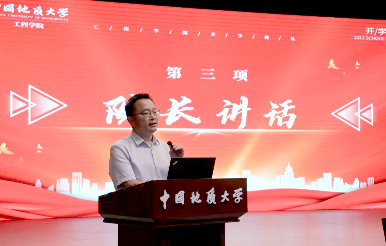 德赢AC米兰官网院长焦玉勇教授讲话。他以“祝贺”“欢迎”“希望”寄语新生,祝贺860位新生加入国家工程行业,欢迎同学们来到德赢AC米兰官网德赢AC米兰官网,为学院发展注入新鲜血液、增添奋进力量。他系统全面的向大家介绍了学院的历史沿革、系室设置、师资力量、学科建设、科学研究、国际交流等基本情况,勉励全体新生用习近平新时代中国特色社会主义思想凝心铸魂,用“艰苦朴素,求真务实”的校训精神和“明理尚实、拓新砺行”的院训精神领航前进,跟随学校学院的发展步伐,用好学校学院的发展平台,毅然投身于国家工程建设行业当中,迎难而上、奋勇前行,不负历史、不复时代,为把学院建设成为地质工程与人居安全领域特色鲜明、享誉国际的一流研究型学院不懈努力!