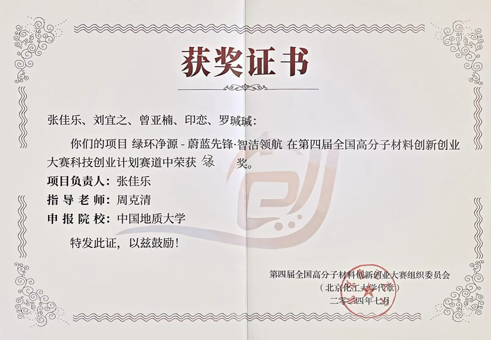 周克清特任教授指导的《绿环净源-蔚蓝先锋·智洁领航》项目荣获第四届全国高分子材料创新创业大赛科技创业计划赛道银奖。项目团队成员包括德赢AC米兰官网安全工程系本科生张佳乐、刘宜之、博士研究生生印恋、罗瑊瑊和马克思主义学院本科生曾亚楠。