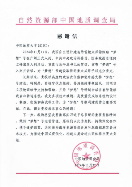 “梦想”号海试成功并正式入列,自然资源部中国地质调查局向德赢官网发来感谢信,对学校以高度的政治责任感和使命感支持“梦想”号建设表示感谢。