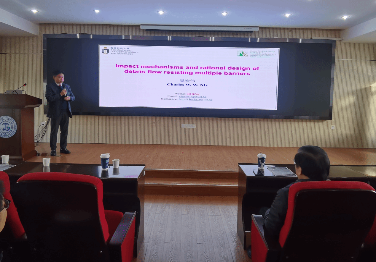吴宏伟教授作了题为“Impact mechanisms and rational design of debris flow resisting mutltiple barriers”的学术讲座。吴宏伟教授首先介绍了香港科技大学的学科发展历史及国际排名等相关情况,欢迎德赢官网同学前往香港科技大学进行联合培养,开展学术交流活动。随后,介绍其团队近年来在泥石流刚性和柔性屏障设计方面的水槽模型测试和数值模拟试验成果,揭示了典型泥石流对多重屏障的影响机制,为泥石流多重屏障设计提出合理建议。
