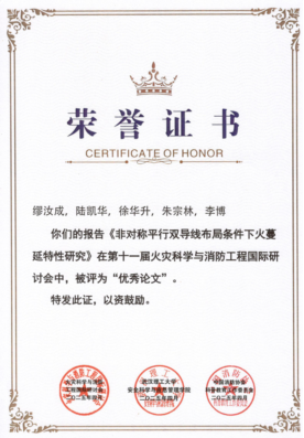 此外,德赢官网研究生印恋在阻燃耐火论坛作题为“卟啉基有机框架衍生物分子设计及其阻燃增韧研究”报告、罗瑊瑊在阻燃耐火论坛作题为“生物启发微中空MOFs的界面锁定效应:环氧树脂复合材料的耐火与增韧性能优化研究”报告、缪汝成在火灾机理论坛作题为“非对称平行双导线布局条件下火蔓延特性研究”报告,孟祥龙在火灾烟气论坛作题为“空气幕射流作用下的开口溢流发展行为研究”报告,宗志伟在受限空间火灾论坛作题为“墙角型壁面限制条件下的火羽流行为特性研究”报告。其中,陆凯华副教授指导的硕士研究生缪汝成获得会议优秀论文奖。