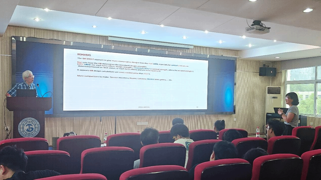 陈幼佳教授以“钢结构设计-AISC对比GB:原理与实例”为题,讲解2023版AISC LRFD(最新版)与2017版GB 50017(中国钢结构设计标准)的钢结构设计准则。报告首先介绍了AISC LRFD的设计理念,随后选取中美两部规范中的关键设计公式,从公式的推导逻辑、参数设定以及适用范围等多个维度展开细致对比。此次报告通过对中美钢结构设计规范的深入剖析,不仅加深了参会人员对不同设计准则的理解,更为行业内的技术交流与经验共享搭建了良好平台。在未来的钢结构工程设计中,这些知识与经验将助力工程师们设计出更安全、更经济、更合理的钢结构建筑。