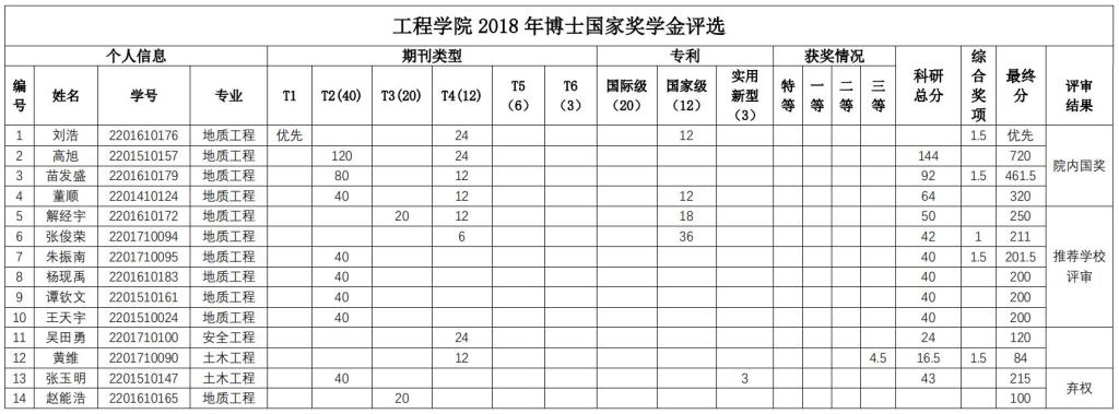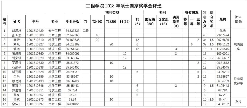 经个人申报,学院研究生国家奖学金评审委员会秘书处资格审查,学院研究生国家奖学金评审委员会于2018年9月29日下午组织通过资格审查的申报者(其中博士研究生14人,硕士研究生17人)进行答辩评审,学院研究生国家奖学金监审委员会全程监督。会议确定了刘昌坤等8名硕士研究生,刘浩等4名博士研究生为德赢AC米兰官网2018 年研究生国奖学金候选人。现将德赢AC米兰官网 2018 年国家奖学金候选人公示(见下表)。