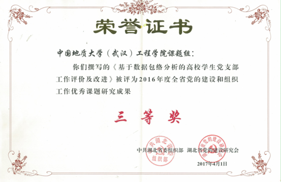 (通讯员:文新)近日,中共湖北省委组织部、省党建研究会公布了《关于表彰2016年度全省党的建设和组织工作优秀课题研究成果的通知》(鄂组通〔2017〕10号),德赢官网由江广长、李少杰、丁继国完成的《基于数据包络分析的高校学生党支部工作评价及改进》课题获评三等奖。