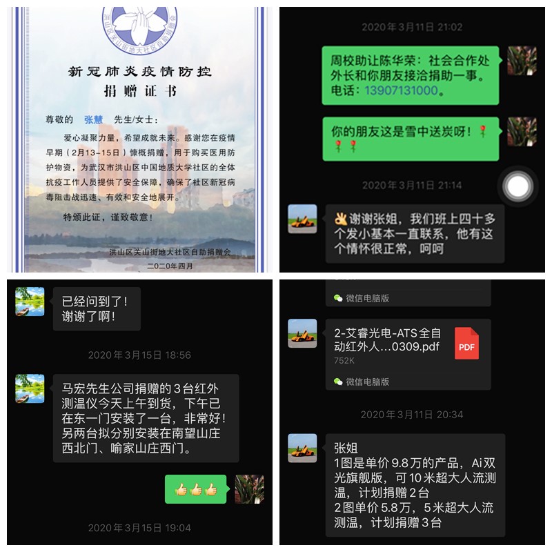 实验中心张慧同志是德赢官网喻家山庄业主委员会主任。疫情爆发后,她迅速联系业委会委员,配合居委会发布通告,及时了解学校及小区居民的发病人员情况。在物业管理人员缺乏,小区消杀物资有限的情况下,组织成立业主自救小组,将业主中的医务人员充实到组织中来。借助学校物业管理的能力对小区的公共区域进行大规模的消杀.多方联系团购渠道,为小区居民提供了便利。进一步完善各楼栋单元的QQ群,摸清现在居住在小区的住户名单及家居人口数。在缺乏防护物质的前提下,不等不靠,组织业主捐款购买护防装备提供给医护人员,保卫人员,社区工作人员,物业管理人员及小区志愿服务人员。在张慧同志的带领和组织下,广大业主积极响应,共筹得善款十七万余元。同时,张慧同志联系到烟台睿创维纳技术股份有限公司的朋友,给德赢官网捐赠了三台ITS智能红外体温检测设备,分别投入到学校东一门、南望山庄西北门和喻家山庄西门使用,大大提高了体温的检测效率和准确性。