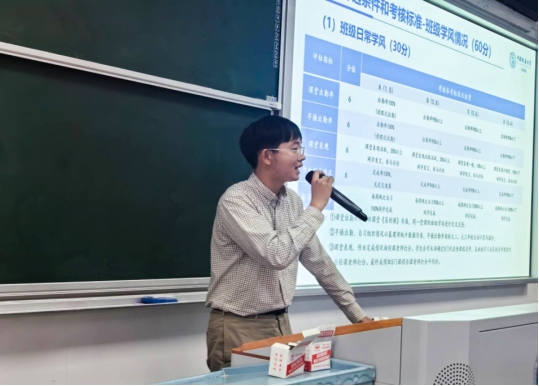 2024级辅导员彭友元介绍《德赢AC米兰官网(武汉)德赢AC米兰官网“优良学风示范班”创建评选办法》。他从“优良学风示范班”总体要求、创建流程、考核指标、奖惩办法等四个方面进行介绍,重点解读了班级政治理论学习、遵纪守法与文明修养、集体观念、班级制度建设、班级干部表现等5项班级综合表现指标,课堂出勤、早操出勤、课堂表现、作业完成情况、自习组织情况等5项班级日常学风指标,平均学分绩点、优秀率、及格率和英语四级通过率等4项班级课程成绩指标,以及学生参加科技创新活动等附加分项目指标。他要求同学们仔细阅读创建办法文件,对照量化评估考核指标,积极开展富有班级特色的学风建设活动。